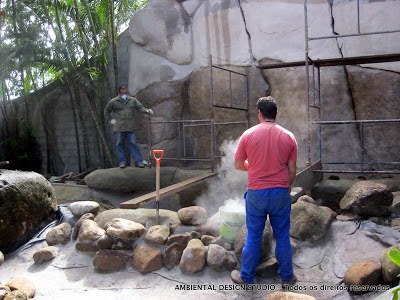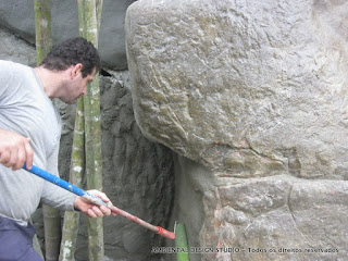Aqui ao lado , Guilherme realiza o início da pintura, dando um fundo marron nas rochas que produzimos. Após a secagem e texturização devemos resinar e colorir as superfícies.